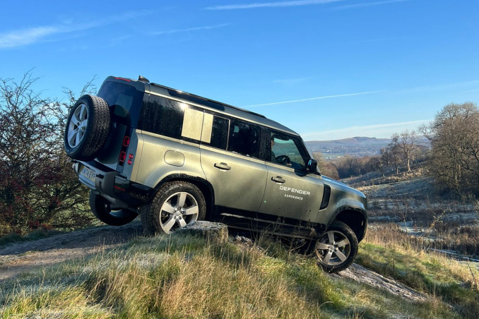 The Land Rover Defender demonstrates its impressive off-road capability while tackling steep inclines during the Land Rover Experience in North Yorkshire.